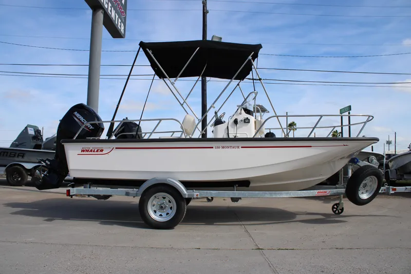 The 15-foot center console boat that can easily take you from the canal to the bay to the beach. Traditional lines and Boston Whaler's legendary unsinkable hull combine for a smooth, soft ride with up to 60 horses moving it briskly through the water. The roomy layout features a fiberglass leaning post, and an optional fishing package makes it a capable inshore angler. The Montauk 150 is truly a small wonder-as easy to operate as it is to own.