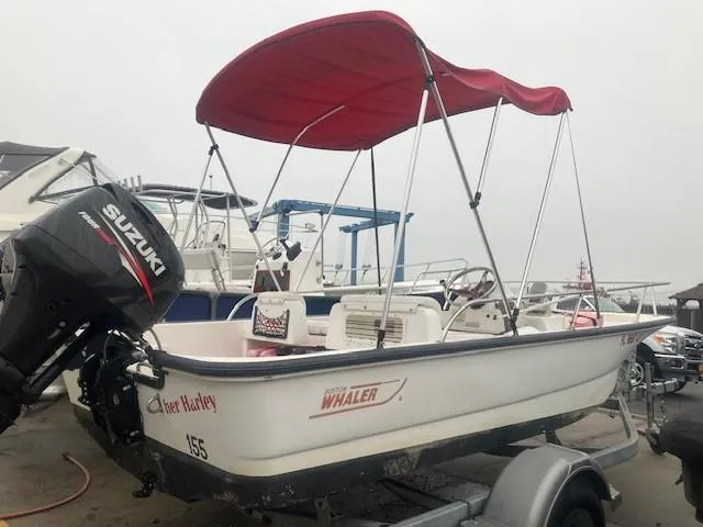 Classic Whaler - the 150 Sport. This model is as easy to use and as fuss-free as the Boston Whaler 130 Sport, but bigger and with extra features for every kind of fun on the water. Exclusive Unibond construction makes the 150 Sport unsinkable. And its wider beam, combined with a twin sponson hull, gives it extra stability and quick planing. And it has plenty of power to spare with a standard 60-horsepower Mercury outboard - more than enough to get an average adult up on waterskis fast. Passengers will appreciate its strategically placed drink holders and built-in rod holders. For added convenience, aft port and starboard boarding steps simplify getting in and out of the boat. The roomy, open cockpit layout features a side console, helm bench seat with backrest and storage, and a removable forward bench seat. Even a 15-foot Whaler features yacht-quality finish and components like stainless steel side rails, a console grab rail, a finished bow locker with a fiberglass cover and overboard drain, bow and stern lifting eyes, navigation lights and plenty more.