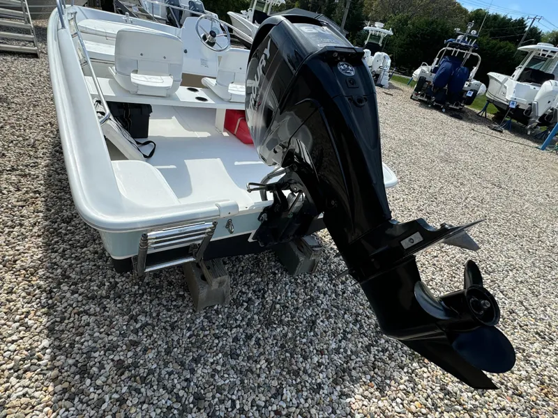 FEATURES: Includes Galvanized Trailer, Light Blue Gelcoat, red graphics, welded stainless steel side rails, heavy duty rub rail; Transom boarding steps and swim ladder, cockpit drain plug, battery box w/hold-down strap, portable fuel tank w/hold-down straps, fiberglass helm seat bench w/drink holders, fiberglass side console w/storage, safety switch, side-mount Mercury control, Stainless steel steering wheel, tachometer, console 12-V receptable, console drink holder, console side seat cooler, bow locker w/fiberglass cover and overboard drain, navigation lights w/rope guide,(4) mini fenders, marine air horn, fire extinguisher, flares, & throw cushion