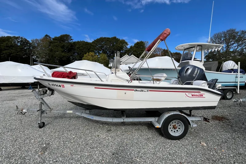 This 2001 Boston Whaler 16 Dauntless has been repowered with a 2023 Yamaha F90LB with just 85 hours. In addition to the new motor in 2023, the boat also had a new Bay Star Hydraulic Steering system and a Garmin Chart plotter/Fish finder installed. This boat has both Bimini top and a Bow Dodger along with a full cushion package including a forward bow cushion, cooler seat cushion and aft jump seat cushions. Also included is both a bow rail and side rails. This boat and motor is also packaged with a Trailer that is registered but currently does not have lights.