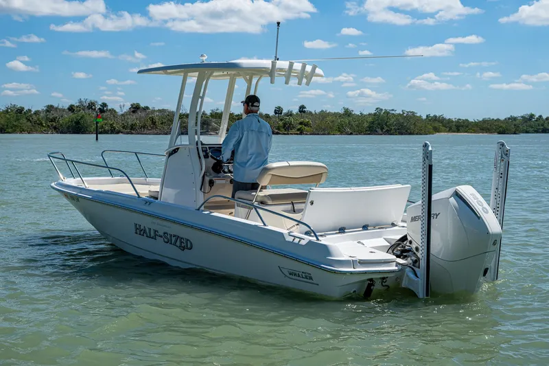 "Half Size" has been very well cared for and lift kept since new. She is the cleanest 210 Whaler you will find on the market today. It features a Fusion White Mercury 200hp Four Stroke with only 52 original hours, recent full engine service, and twin 8' Power Poles.. Full cushion package and helm, leaning post, and motor covers.