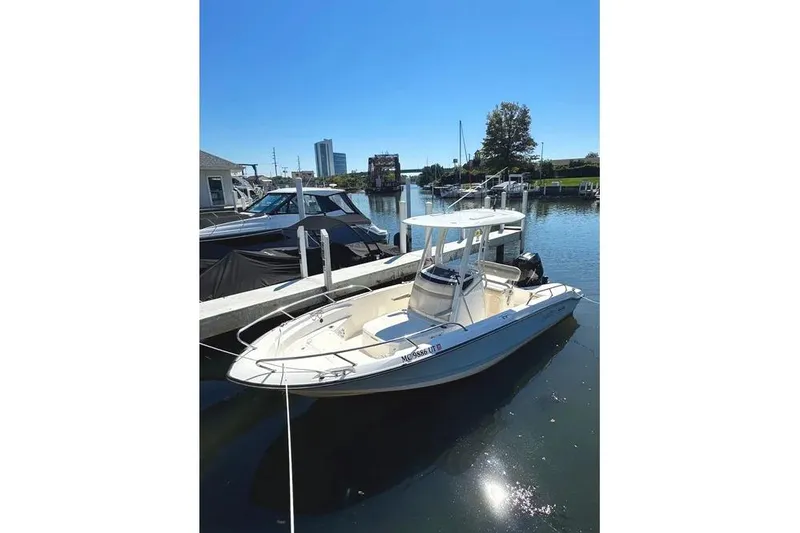 The 220 Dauntless blends serious fishing capability with the comfort and versatility families love in a center console. Outfitted with a Raymarine navigation system with built-in VHF, Mercury Vessel View, and a Fusion stereo, the ergonomic helm delivers total control. The T-top provides shade, overhead storage, and 4 rod holders, while the 4-position reversible pilot seat includes an integrated live well.