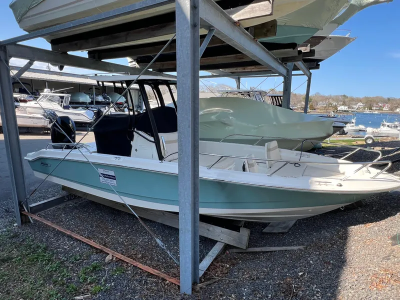 This 250 Dauntless is powered by a Mercury 300 XXL V8 AMS 4-Stroke engine and features a Glacier Green gelcoat hull side color with Glacier Green gelcoat undercoating under the hard top, black graphics, canvas and hard top frame colors, anchor roller, split bow rail, white rub rail w/ stainless steel insert, bow table, competition leaning post, plumbing package, electric trim tabs w/ indicators, fiberglass hard top, raw water washdown, glove box, Fusion stereo with premium audio package, Simrad VHF radio, Simrad 12" NSX navigation package, combination helm seat and console cover, anchoring package, York Harbor Marine Coast Guard safety package and much more!
