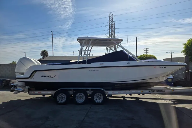 Introducing the 2014 Boston Whaler 270 Vantage, a remarkable dual console boat with an overall length of 28.25 feet. This used vessel boasts a robust fiberglass hull designed in a deep vee shape, ensuring exceptional stability and performance on the water. Equipped with twin Mercury Verado outboard engines, each delivering 225 horsepower, this boat promises thrilling adventures with a total of 450 horsepower. The stainless steel 4-blade propellers enhance efficiency and responsiveness, making every journey enjoyable. Designed for comfort and socializing, the Vantage accommodates up to 12 passengers, making it perfect for family outings or gatherings with friends. Its thoughtful features ensure a delightful experience, whether you're cruising along the coast or anchoring for a day of fun. The Boston Whaler 270 Vantage is a perfect blend of performance, comfort, and style, ready to create unforgettable memories on the water.