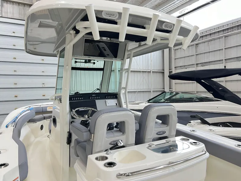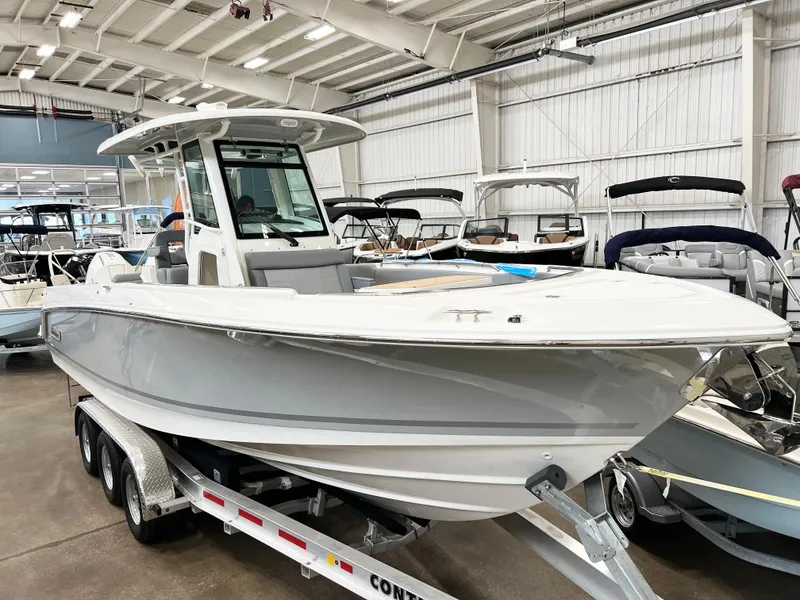The 280 OR is powered by reliable Dual Joystick 300 V8 AMS Mercury Outboards, delivering smooth and efficient performance in a spacious 28-foot design. The Fore and Aft Seating Package provides comfortable and adaptable seating options, perfect for relaxing or entertaining guests. Ample storage ensures all your boating essentials are securely organized, while the Nav. Package featuring a Simrad 7" NSX offers advanced technology for seamless navigation. A galvanized trailer with disc brakes and radial tires is included for easy transport.