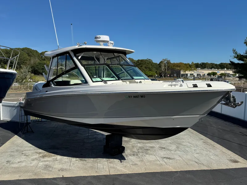 2023 Boston Whaler 280 Vantage Hull Color: Gray/White 2-tone Twin Mercury v8 Verado 300's (95 Hours) Warrantied PLATINUM 3/10/2030! Simrad Electronics: NSX-12 GPS/Plotter Halo 20 Radar RS20S VHF Radio Fusion Audio Cockpit Refrigerator Full Enclosure w/ Drop curtains Two 25 Gallon Insulated in-floor fish boxes with pump-out Transom door with stainless steel latch Covered telescoping swim ladder with stainless steel grab rail Molded fiberglass port side dive/boarding door with removable stainless-steel dive ladder and deployable grab rail Integrated centerline 12-gallon Bow cooler