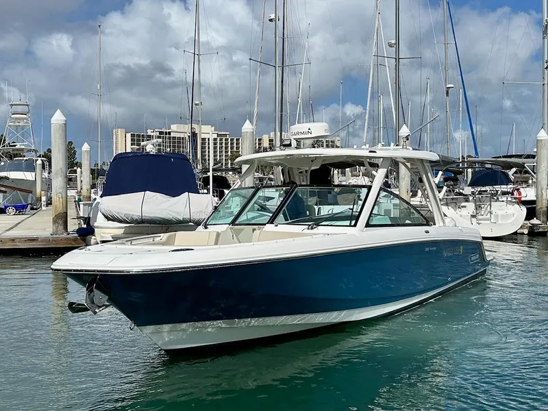 The 320 Vantage is the next evolution in dual-console capability. Cutting-edge features and amenities are the hallmarks of this multicapable model. The portside companion area features two spacious benches with multiple configurations--facing forward or aft, combined to form a huge sun lounge... the list goes on. At the helm, a state-of-the-art VesselView display and modern electronics. Strong, reliable and efficient Mercury Verado® outboards power day-long watersports or cruising. The 320 Vantage also features a starboard dive door with a removable stainless-steel ladder for easy water access. And with generous port and starboard console compartments, featuring a convertible berth and a well-equipped head, respectively, every member of the crew can enjoy added comfort. When the softest, safest ride meets the best equipped dual-console around, new possibilities become eminently possible.