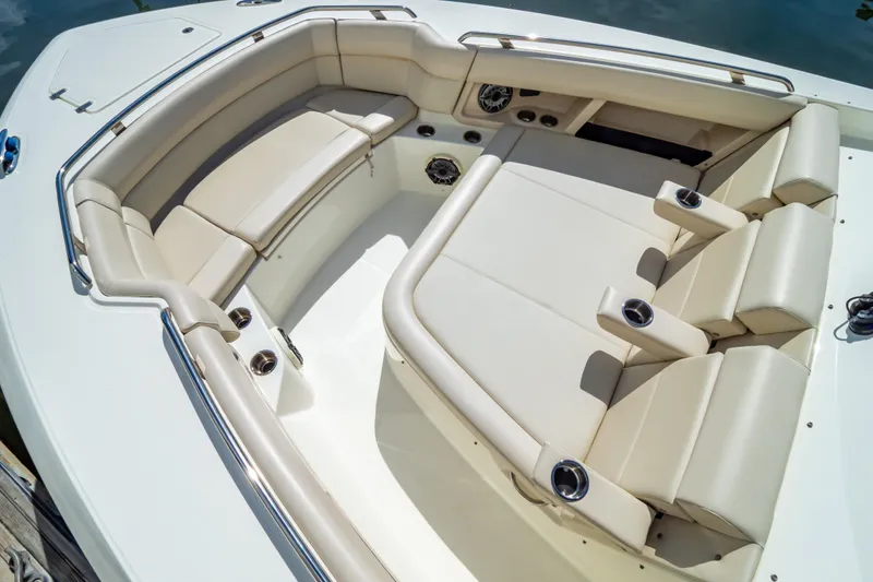 - Robust forward console lounge includes fold-down armrests and drink holders, with forward island deck seating opposite.
