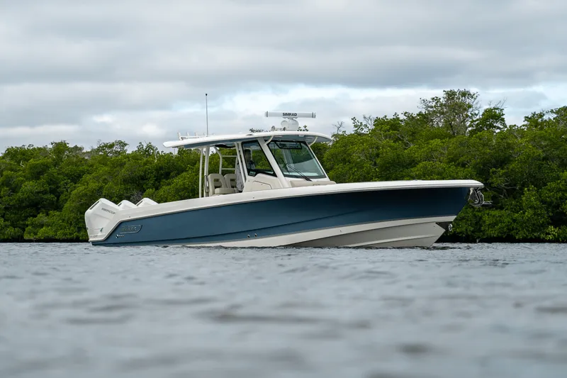 The 360 Outrage represents a new standard of excellence for offshore center consoles. Designed from the keel up to maximize space and functionality, the 360 Outrage delivers an effortless boating experience and a tremendous amount of flexibility. Cutting-edge technology is evident throughout, from the intuitive helm station to the available lithium-ion battery system. Thanks to its perfectly power-matched propulsion options, including the new 600-hp V12 Mercury® Verado®, the 360 Outrage is not only the most versatile and ergonomic center console on the market - it's also the most fun. Triple 300-HP Mercury engines with options including triple 450-HP Mercury FourStrokes or twin 600-HP V12 Verados to deliver exhilarating speed, acceleration and precision with maximized fuel efficiency. Advanced Fathom technology, a first-of-its-kind boat electrification system. A state-of-the-art helm station, now with user-friendly Simrad technology and larger electronics, available Joystick Piloting, and DockSense deliver effortless command. Digital switching technology empowers remote control of key systems. Available gyro-stabilization ensures comfort in rolling seas. Reconfigured bow seating affords more space and easier access to the windlass/anchor and improved ability to fish from the bow. More personalized cockpit offers options for a grill and Corian countertop.Improved storage throughout the boat, resulting in more useable bow storage, a more organized cabin, and betterdesignated sleeping space in the V-berth. Centerline hardtop access lets climber feels much more secure, and the style lines of the boat are improved as well