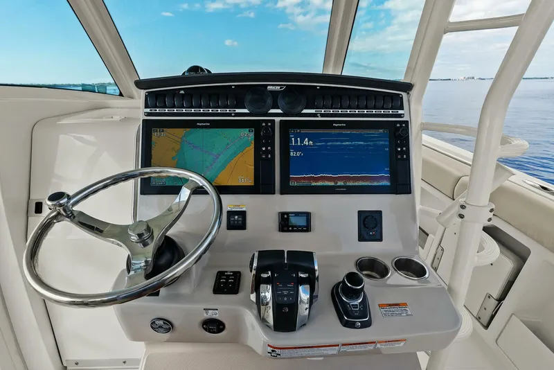 Equipped with premium electronics, including dual Raymarine Axiom 16" displays, a 3D transducer, Raymarine Magnum open array radar, Ray 50 VHF with 8' antenna, and a Fusion stereo system, you'll have everything you need for confident navigation and entertainment offshore.
