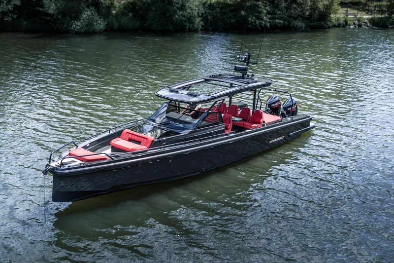The Brabus Shadow 900 Black Ops Limited Edition "1 of 37" is built on the Axopar 37 hull and is powered by twin 450 HP Mercury racing outboards, reaching over 60 knots. The Limited Edition model features a Gunmetal Grey paint scheme and Brabus Red exterior upholstery, turning heads and leaving a lasting impression. The forward cabin seamlessly integrates with the fore deck through the opening Gullwing doors, providing a social experience and maximized use of every inch of space.