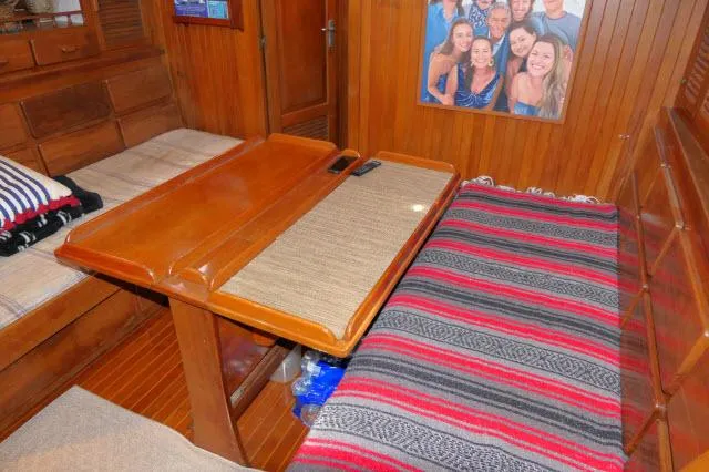 Entering from the forward end of the center cockpit, the galley is to port and the chart table with drawers is to starboard. Next forward are the settee/berths both port and starboard with a centerline fold-down dinette table. There is plenty of storage both behind and below the settee/berths.