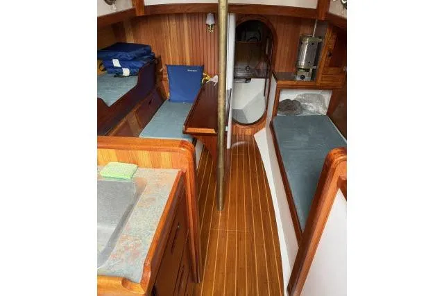 Entering thru the main companionway, the galley is to port and a top loading ice box to starboard. There is very generous engine access behind the easy-to-lift-out ladder. Amidships, there are port and starboard settees, with a pilot berth to port that makes into a double. Forward of the mast is the head and storage.