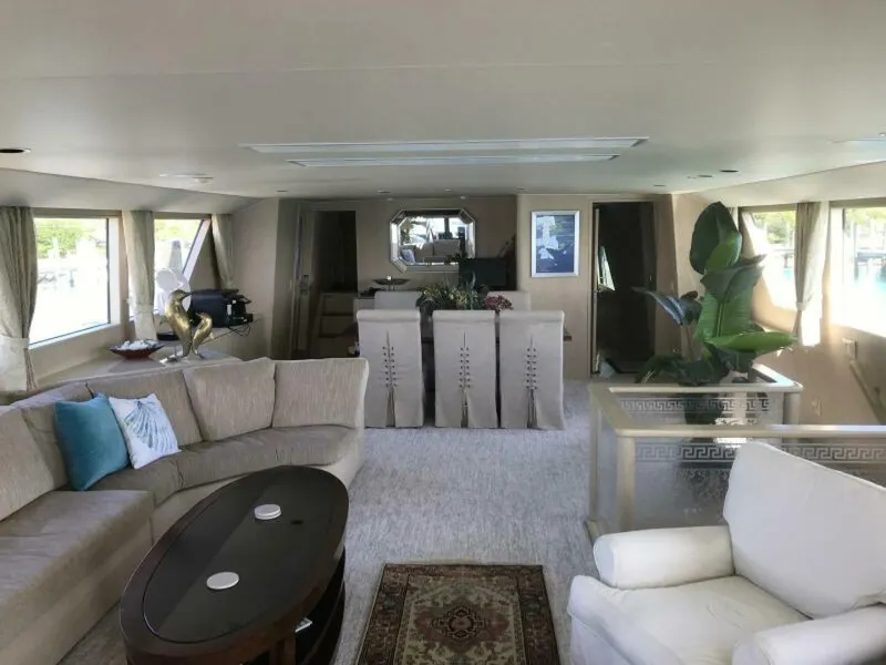 The Salon is entered via a center opening door; being full beam this area is immense and stretches forward into a formal Dining Area. To port is a large C shaped upholstered settee to seat six to eight people. To starboard are two swivel occasional chairs slightly in front of a popup TV. Next forward are the steps to the four ensuite Guest Cabins. Large side and aft windows add an incredible amount of daylight.
