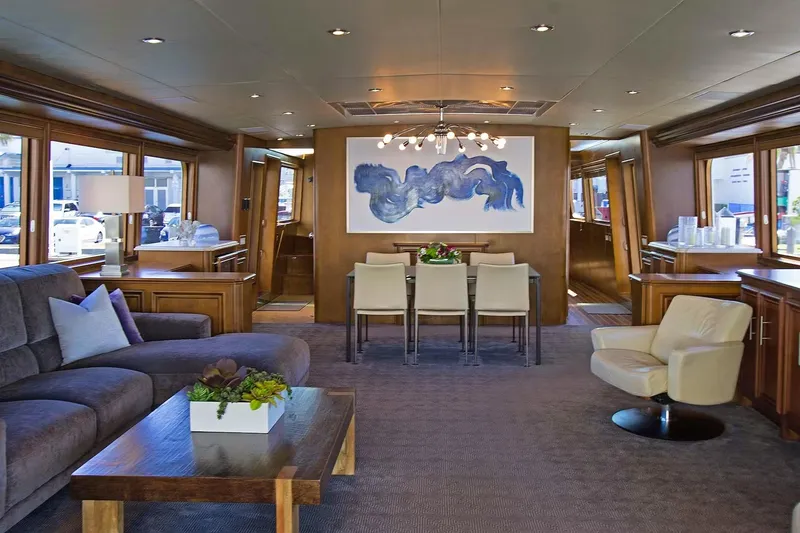 The main deck features a spacious main salon with dining area. The gourmet galley has its own dining area with seating for eight guests in a modern country-style kitchen, offering breakfasts and casual snacks throughout the day in a comfortable atmosphere. Alfresco cocktails and dining can be enjoyed on the oversized sheltered aft deck.