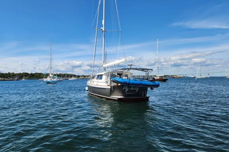 FLY AWAY is hull #9 of the 11 Bruckmann 50s built to date. She is a MKII version with an integral swim platform and longer waterline. Her lovely silver-gray Awlgrip hull and gleaming brightwork complement a beautifully crafted interior. Inside, she features a two-stateroom layout plus a TV den/library that offers an additional berth if needed. The interior is finished in Herreshoff white with gloss-varnished mahogany trim. The galley is light and airy, with a huge refrigerator and a separate freezer. The pilothouse includes a U-shaped settee around a hi/low table. Opposite are two easy chairs, one of which converts into the helmsman's chair at the inside steering station. Powered by a 200 HP John Deere, this boat is designed for long-distance passages in comfort. She is equipped with all the systems one could want: lithium batteries, air conditioning, generator, inverter, bow thruster, Starlink, recent Garmin electronics, new Doyle sails, and a furling boom. She is fully up to date and has been lovingly cared for by experienced owners. Don't miss this one!