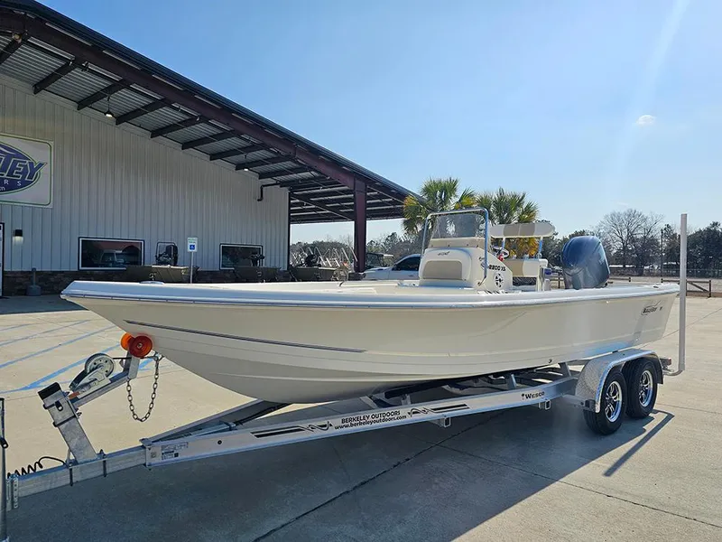 This White Bulls Bay 2200 XS has a Yamaha F150XC outboard motor.