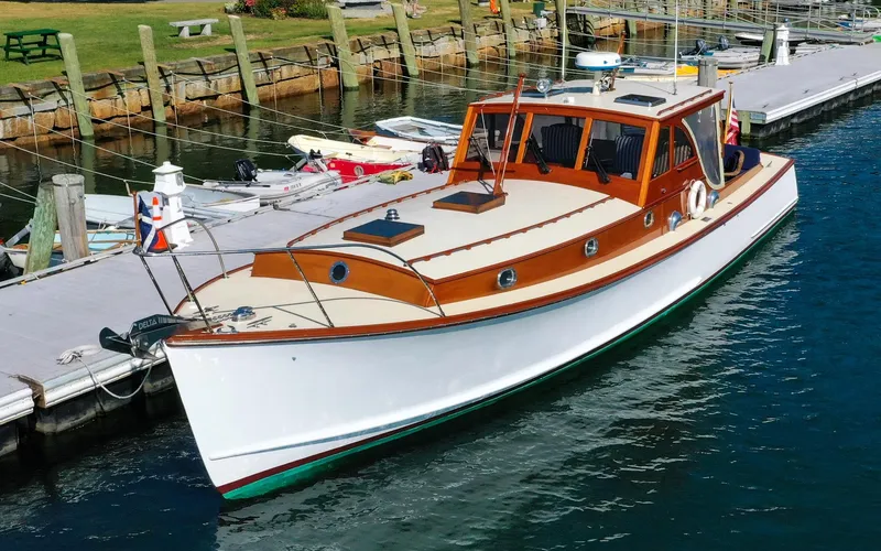 1" cedar planks over 2 1/2" x 1 1/4" steam-bent oak frames. Oak stem, keel, deadwood, and stern frame. Mahogany transom, cabin and shelter sides. Evidure screw fastened; hull was refastened below waterline by the Ralph Stanley Yard in 1996 with No. 14 screws.