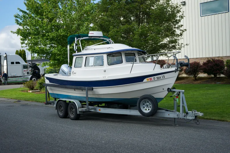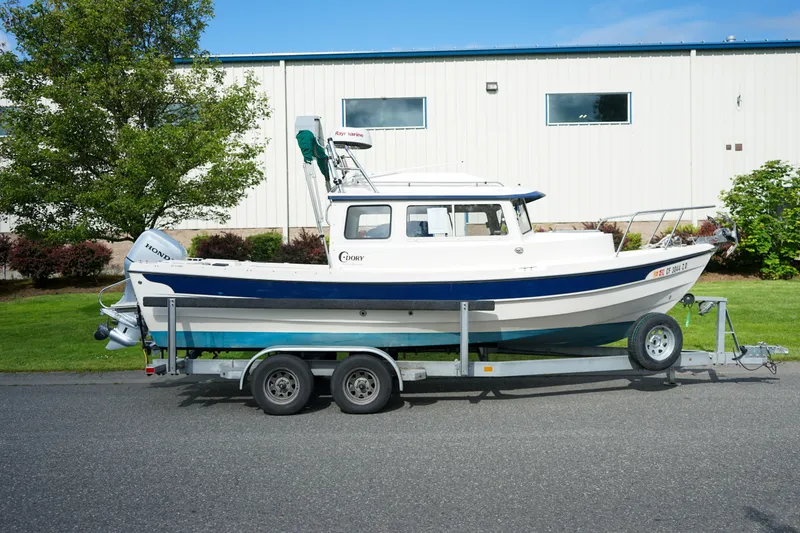 The most successful C-Dory model, the 22' Cruiser, was first introduced in January 1987. It has enjoyed a steady production run. Many refinements based on customer input rather than on fashion trends, have been incorporated over the years. Materials used in the construction of the boat have been constantly upgraded, ensuring that the model keeps pace with the technology available today. A practical boat, the C-Dory 22' is designed and built to be seaworthy, easily maintained and affordable to operate. Although a full-size cabin cruiser, it is relatively light and well balanced for easy towing and invites the owner to explore distant waters. Average towing weight is about 4390 lbs boat, motor, trailer, & fuel.