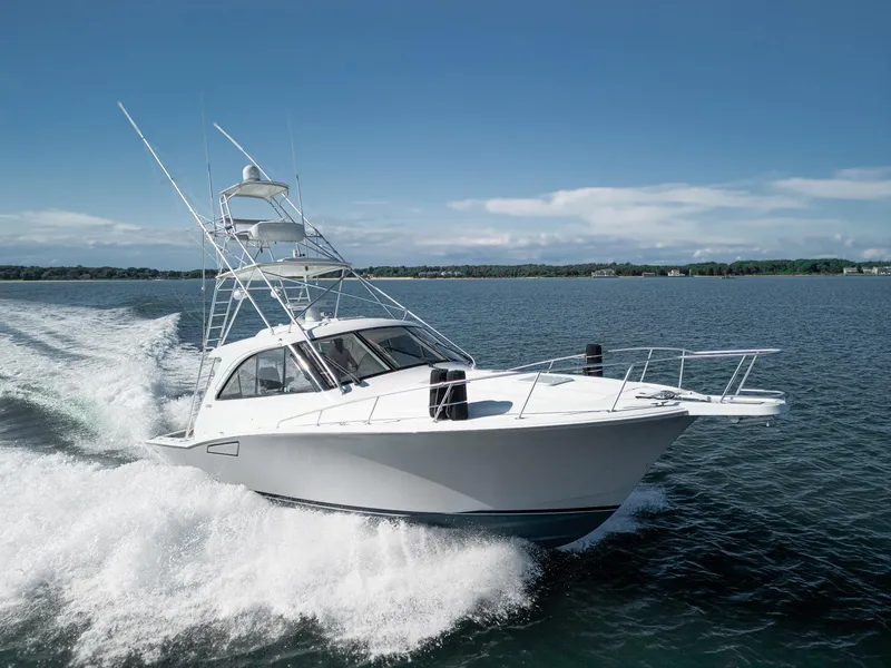 This 44 HTX is an extremely well-maintained vessel, freshly painted Kingston Gray, recently upgraded with new Garmin electronics, Dockmate docking system, recent 1,000 hour service on her 1015hp CATs. All new soft good and so much more. "Wanted" features the sought-after single-stateroom layout with the "Anglers Room" which provides for integrated rod storage and a larger salon. Aside from her new Garmin electronics she also features, Pipewelders tuna tower, triple Stidd helm seats, bow thruster, FLIR, underwater lights, Release Marine rocket launcher, built-in live well plus so much more.