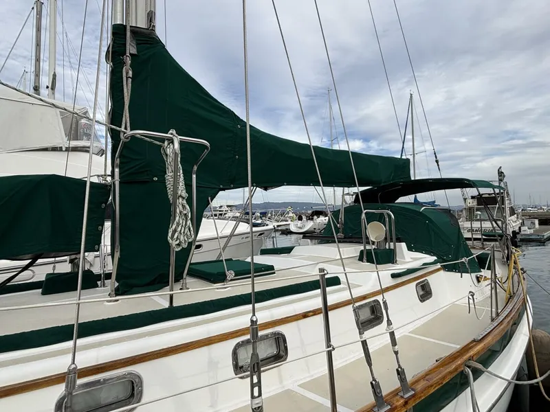EMERALD STAR is a beautiful sailing vessel with the classic look of days gone by. This full keel Cabo Rico 38 is a true offshore yacht. Designed by William Crealock, it is highly regarded among those who choose the cruising lifestyle. EMERALD STAR has been loved and cared for by her current owners since 2003. They raved about the simple ergonomics and sailing her as a couple. She has recent bottom paint, and a new shaft seal. The exterior varnish has just been refreshed. The interior was revarnished in 2020. The folding salon table is a work of art. She is hull number 151 with many custom upgrades. Her layout includes abundant cabinet storage, the shower is separate from the head, and the captain's stateroom in v-berth. No aft cabin means more storage. The settee can become a double berth for guests. Make an appointment to see this unique cruising vessel by texting Michelle at (510)646-1091.