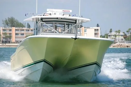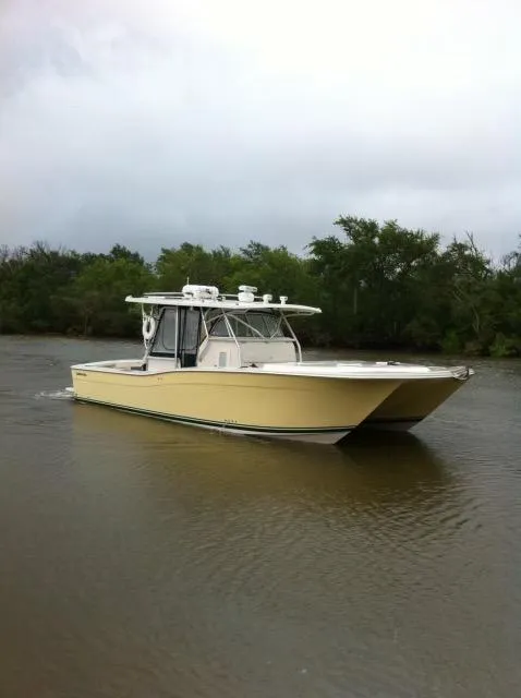 Located in Louisiana, protected from the elements. She is kept out of the water in covered boat house projected from the sun & UV since new. She is powered by twin 370 hp supercharged Volvo Penta diesels I/O with about 1000 hrs, 50% of those hrs were at idle during overnight tuna trips. The engines run all night and only burn 1/2 gal per hour combined. 12 hrs at idle overnight and only burn 6 gal. She holds 364 gallons total in town 182 gal fuel tanks.