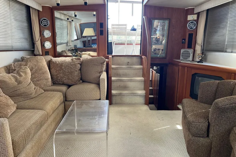 One enters from the enclosed sundeck through a glass door and down three steps to the carpeted salon. There is an L shape convertible sofa to starboard with a leucite coffee table and track lighting overhead. Electrical panel is forward. Two swivel chairs to port with cabinets outboard. A Philips Magnavox TV is built in and there are mirrors on the aft starboard bulkhead and forward port. The windows in the salon slide open with screens and miniblinds.