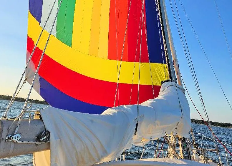 Keel stepped mast. Fully-battened mainsail, two genoas, including a 150% roller-furling light air genoa. Three spinnakers including a 0.75 oz. triradial, 1.5 oz. triradial, and a cruising spinnaker. Hood roller furling system. Stearns hydraulic backstay adjuster. Hydraulic boom vang. Baby stay. Mainsheet traveler on bridge deck. Spinnaker pole. Lewmar #55 self-tailing primary winches. Lewmar #45 self-tailing secondary winches. Barient #10H reefing winch on boom. Deck-mounted winches at mast: Lewmar #40 self-tailing, 3 Barient 21's. Winches mounted on cabin top just forward of cockpit: starboard: Lewmar #40 self tailing and Barient #16, port: two Barient #16's. Eight line clutches mounted on cabin top, four to port, four to starboard.
