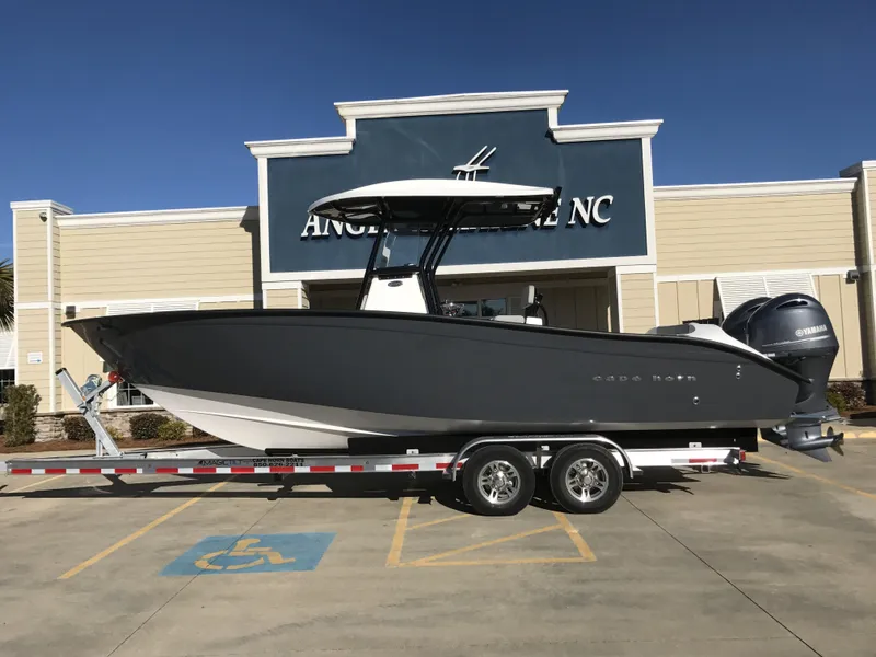 2026 Cape Horn 27XS, powered by twin Yamaha F200's. As with every Cape Horn, this boat is unsinkable due to Cape Horn's unique build design. Standard features include: extra front bow seating, t-top with electronics box, spreader lights, walk-in console, leaning post with backrest, electric trim tabs with indicators, auto bilge pump, coaming bolsters, tilt wheel hydraulic steering, porta potty, raw water washdown, 7-foot insulated fish box, and tandem axle aluminum trailer with brakes.