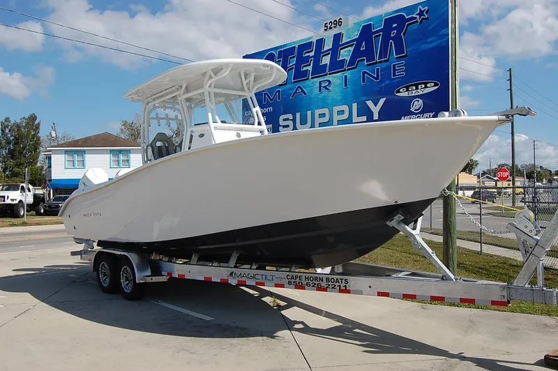 The all new Capehorn 28XS powered by Twin Mercury 300 V8's has arrived. This boat is ready to take you fishing or to the sand bar. It has many features that are hard to come by in one package. It is equipped with the following, Hardtop, white powder coating, rear legs, vaccu flush toilet, house battery, EPS steering, windlass and bow roller, Storm Grey hullsides, Gunmetal bottom. It has a beam of 9'1" and a length of 28'7". The fishbox is huge and the boat has plenty of storage. Boww seating with backrest, pull out rear seat, Call anytime for more information.