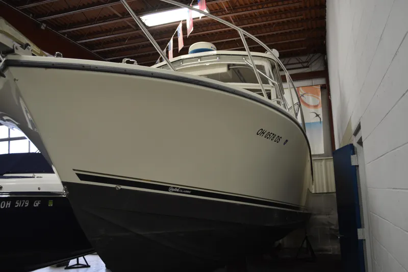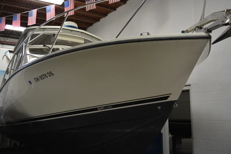 The 28 is a machine totally designed and precisely built for one purpose: Offshore trophy fishing. Because fishing conditions vary, we offer a combination of twin engine power and drive choices. Gas or diesel. Conventional inboard or jack shaft to sterndrive. And long-range fuel capacity for all. Plenty of living room, too. A cabin with six feet of head room. V-berth with filler. Galley with microwave, sink, refrigerator and table. Full walk-in electric head with shower. And storage areas throughout. Best of all is how easy she is to maintain. The dry, oversized engine compartment provides roomy access to the hydraulics, generator, pumps and batteries. The bilge runs in a tunnel underneath the gel-coated engine room, so all vital mechanics stay dry and clean. The air intakes are high above the sheer to keep corrosive salt spray out. Even the cabin walls are finished gel so they can be easily cleaned and kept free of mildew. The 28 is complete. There's a very short "extras" list. The most popular is the command tower, which encloses the lower helm station and provides a complete second station above.
