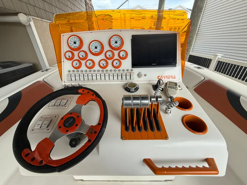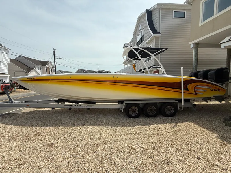 This 2007 Carrera 36 Open is in very good condition, powered by triple 300HP Mercury Optimax engines with just over 200 hours making a cruise speed 40-50mph easy. Also offering dual live wells to make a day of fishing more than possible. The sleek orange design on this boat is head turning. The cockpit and bow area offer a ton of space to make the whole family comfortable as well as offering a very spacious head. The Garmin Radar was just upgraded as well as an upgrade on the screen itself, all gauges were also recently replacedSale includes a Real Extreme triple axel trailer.