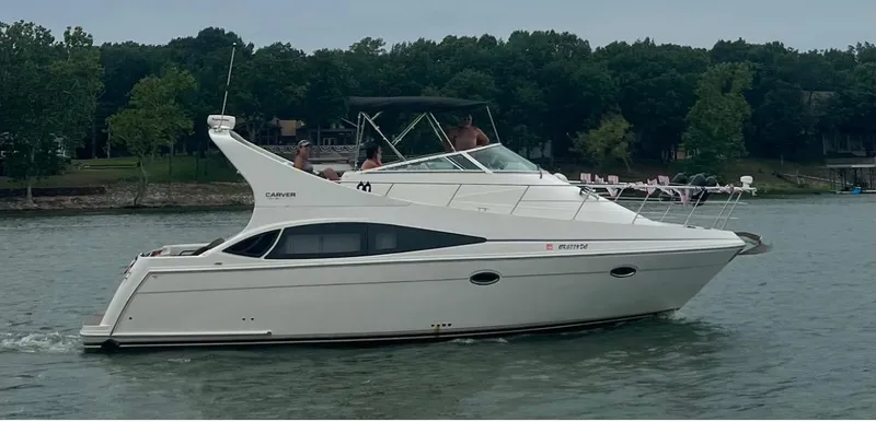 The Carver 360 Mariner has distinctive exterior styling and an incredible single level floor plan that makes it one of Carver's all-time, most popular yachts. The cabin offers a party sized salon and available sleeping accommodations for six. Two integral fiberglass stairways lead to the flybridge which provides seating for eleven. There's also a wet bar, port and starboard lounges and aft four-wide bench seat, plus a control console with full instrumentation and full wrap-around windshield. The 360's huge cockpit gives you plenty of room to enjoy all types of water sports and entertain your family and friends. The integrated transom platform includes a stowaway ladder.