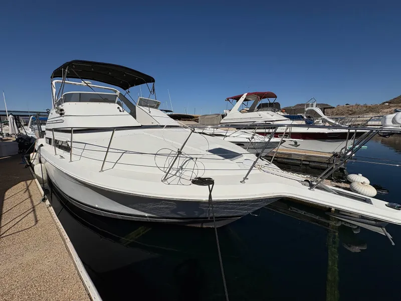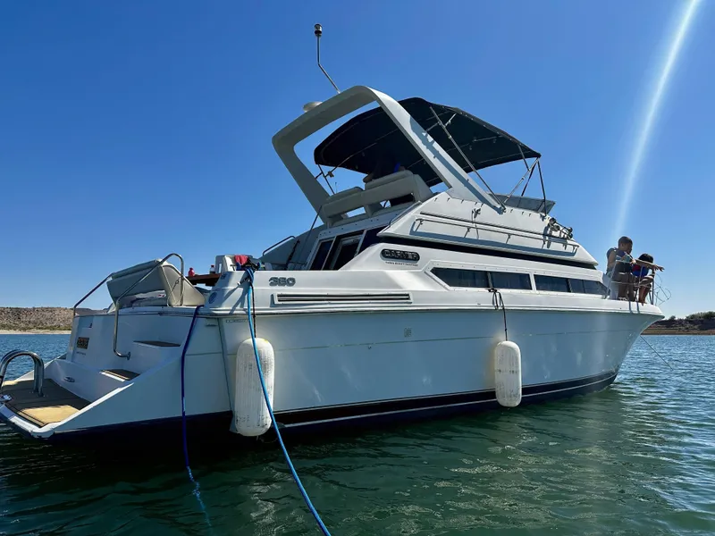 1994 Carver Santego 380, Exceptional Carver Santego 38 located at Lake Pleasant, perfect for those who seek both adventure and relaxation on the water. This well-maintained vessel offers a pristine experience for boat enthusiasts. 1. The boat includes a dedicated wetslip, ensuring a hassle-free experience for avid Lake Pleasant boaters. 2. Known for its fiberglass hull and conservative design, the Santego 38 promises reliability and durability, making it an excellent choice for both new and seasoned boat owners. 3. Highlighted by its large, open flybridge, this model offers extraordinary visibility and a breathtaking view of the surrounding landscapes. 4. Inside, you'll find a spacious condo-style interior, perfect for entertaining or extended cruising. 5. Equipped with two A/C units, comfort is guaranteed during the hottest summer days. 6. A generator is onboard, supporting all your power needs while away from the dock. 7. The bridge enclosure provides protection from the elements, enhancing the navigation experience. 8. Powered by twin Crusader 454 engines, this boat combines strength and performance seamlessly. 9. Recent updates include new upholstery, custom Eisenglass shades, and new sea decking, adding both style and functionality. 10. Engine performance has been enhanced with a recently rebuilt port motor and a starboard top end that was rebuilt less than 20 hours ago. Whether you're looking to entertain friends and family or enjoy a peaceful cruise on the lake, this Carver Santego 38 is ready to set sail with its new owner. Don't miss your chance to own this remarkable boat; contact us to schedule a viewing today. Century Marine carries an outstanding selection of New and preowned boats including; Centurion, Regal, Supreme, Veranda, Sea Ray, Chaparral, Rinker, Malibu, Maxum, Sleekcraft, Cobalt, Mastercraft and Carver. We carry pontoon boats, cruisers, wakeboard boats, ski boats, jet skis, houseboats and sailboats. Let our years of experience help if you on your next boat purchase. If you have questions on the sales programs or financing options, please give us a call. We would love to meet with you and see how we can assist you in your boating or RV needs. Century Marine at Lake Pleasant Harbor is located 35 miles northwest of downtown Phoenix, on the southeastern shores of Lake Pleasant.