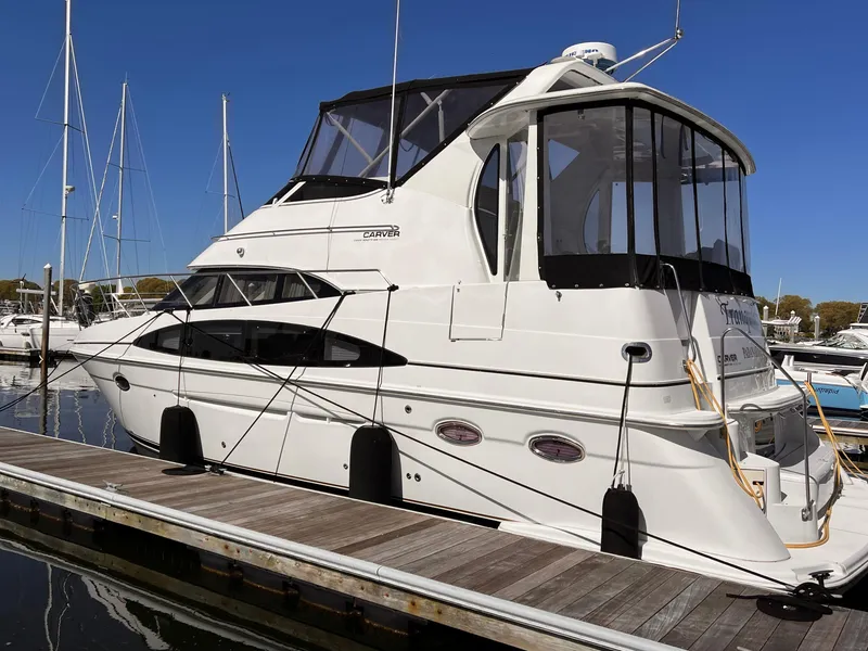 The Carver 396 Motor Yacht is striking and spacious. By raising the gunnels, Carver has opened up the cabin, stretching it the full width of the 13-foot 11-inch beam. Because the salon, galley, and dinette are all part of one "great room" concept, guests are given the freedom to roam. Plus, the two-tiered window system provides perfect line of sight outdoors, whether seated on the plush salon furniture, or while preparing meals in the fully equipped, casually sunken galley. Below deck, the aft master stateroom has incredible amounts of storage, a queen-size, inner-spring island berth, and a private head complete with separate head and shower compartments. The forward guest stateroom has a queen-size island berth with an inner-spring mattress, and a split head arrangement with separate shower and water closet. When it's time to spread out, passengers will appreciate the approximately 73-square-foot aft deck protected by standard wing doors, a hardtop, and a weather cloth that's molded right into the deck. And, an integral stairway leads to the yacht's command bridge with seating for six, and a centerline helm for maximum visibility. A wetbar with available refrigerator or icemaker helps make this bridge and aft deck the perfect entertaining platform.