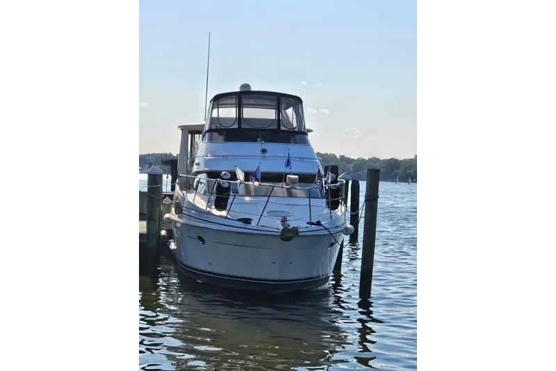 The Carver 444 Cockpit Motor Yacht combines the superb luxury and spaciousness of an aft cabin with exceptional contemporary styling and thoughtful design. Carver's signature raised walk-deck design also allows for a wider, much roomier cabin than other yachts this size. Combined with the way Carver united the salon and galley into one spacious and elegant "great room", this adds up to outstanding cruising comfort. The expansive great room features all sorts of amenities, from the sumptuous designer decor and Ultra-Leather sofa, to the beautiful yet practical solid-surface countertops. When it comes to sleeping accommodations, owners will welcome the unexpected luxury of two private staterooms, each with its own private head compartment. On the bridge, passengers can relax with the L-shaped lounge that seats five and the wet-bar that provides convenient bottle storage. The elegant aft deck offers a hardtop that covers the entire deck, plus an electronics arch, and the convenience of an integral bridge stairway and wing doors. For even more fun, the large cockpit offers plenty of space to play.