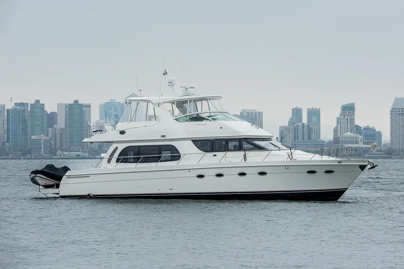 2005 Carver 560 Voyager Pilothouse. This LLC owned yacht is a heavily built yacht, designed for extended cruising and comfortable dockside living. This Carver is in a premier San Diego slip location which can be available after purchase with dock master approval. Step aboard and into the large 70-square-foot cockpit that provides overhead sun and weather protection. You'll step from the aft deck into a spacious salon and galley. The salon offers the ultimate in living space with extra-large, frameless windows to let in plenty of light. Elegant furnishings provide comfort. The galley features black Corian counter tops and is very well equipped. The sky lounge makes for an elegant setting for entertaining and relaxing comfort. There are three staterooms, with a mid-ship master which has an island queen berth, separate head, shower, tub, and washer/dryer. The forward VIP also has a full queen berth and private access to the day head. The third stateroom has two single bunks. Once up top, you will notice the large u-shaped seating and table, wet bar, grill, open back for portable chairs, and double wide lounge. A second helm station is located on the flybridge to offer extremely clear 360 degree visibility. With its remarkable fuel capacity, the 560 can cruise farther than other yachts in its class. Well maintained, this is a capable and proven coastal cruising boat that is ready for a new owner.