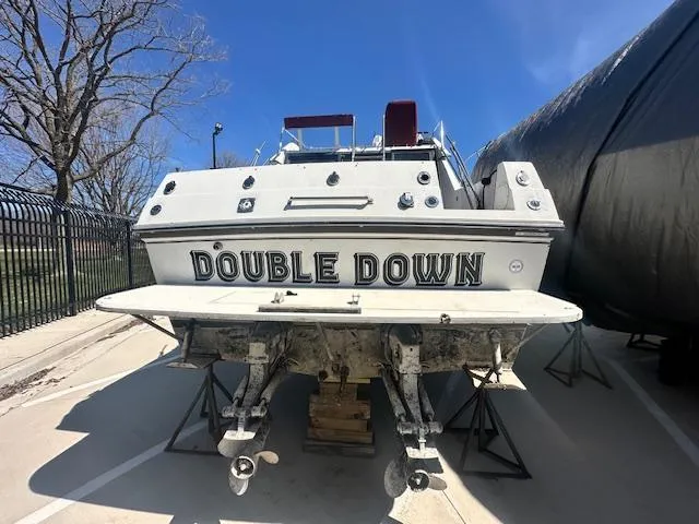 A ton of boat for the money! Double Down has been in the care of her current owners since 2005. She has always been freshwater kept. Her canvas and eisenglass was replaced in the last couple years. New throttle cables and replacement gauges were also installed. A hatch style A/C unit is also included. The starboard motor is in need of a starter. The boat was in the water last year and is currently stored in the pen at McKinley Marina in Milwaukee. Don't miss out on this great deal, Contact us today!