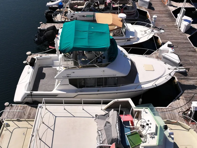 1996 Carver 320 Voyager, The 1996 Carver 320 Voyager blends spacious design, solid performance, and enduring craftsmanship in a 32-foot flybridge cruiser built for comfortable cruising and entertaining. Its modified-V hull delivers a stable, confident ride in a variety of conditions. The large flybridge features dual helm seats, companion seating, and excellent visibility, while the cockpit provides easy boarding and access to the swim platform. Below deck, the well-appointed cabin includes a full galley, convertible dinette, private forward stateroom, and enclosed head, offering overnight accommodations for up to six. Powered by twin Crusader inboards, the 320 Voyager delivers reliable performance, smooth handling, and Carver's signature commitment to quality and livability.