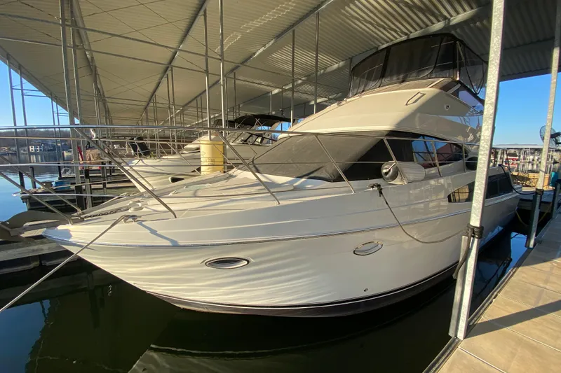 Here's a beautifully kept Carver 38SS that has always been in the freshwaters of Lake of the Ozarks and is ready for its next owner. The motors & generator have had their oils changed this year and impellers were done in 2024. Buff, Wax and Bottom paint were all performed by Big Thunder Marine in 2023. The Kohler 7.3 kW gas generator has 409 hours of use. The boat does have a bow thruster but it is not operational at this time.