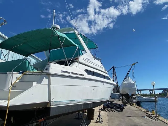 The Carver 380 Santego has been a popular boat in the Carver fleet for many years thanks to her spacious condo-style interior. The Santego's expansive salon - with facing wraparound settees and twin dinettes - create the kind of party-time accommodations seldom encountered in a boat this size. A pair of full height sliding glass cockpit doors provide an abundance of exterior lighting, and the wide-open expanse of a single-level floorplan has to be seen. There's seating for a crowd on the huge flybridge where concealed steps in the windshield forward out provide a walkway to the foredeck. Hatches in the cockpit sole provide good access to the motors and v-drives and there's built-in lounge seating in the cockpit.
