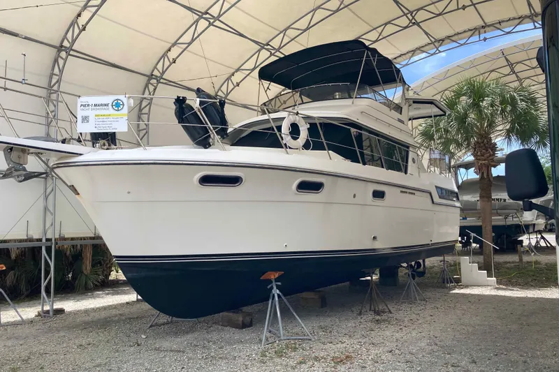 This maybe the cleanest and best maintained 38' Carver in Florida. She has been a fresh water vessel until 11/24. The owners have done a great job keeping this boat looking and working great.The boat comes with twin 350 HP Crusaders with only 1011 hours, generator with only 551 hours, air conditioning and heat, automatic anchoring system, two heads with showers, sleeps 7, full galley to include refrigerator w/freezer, stove w/oven, microwave, sink and great counter and storage space, full canvas on the bridge and mid deck, excellent electronics, very nice boarding steps from dock to boat, mid deck wet bar with fridge plus much more, see below.