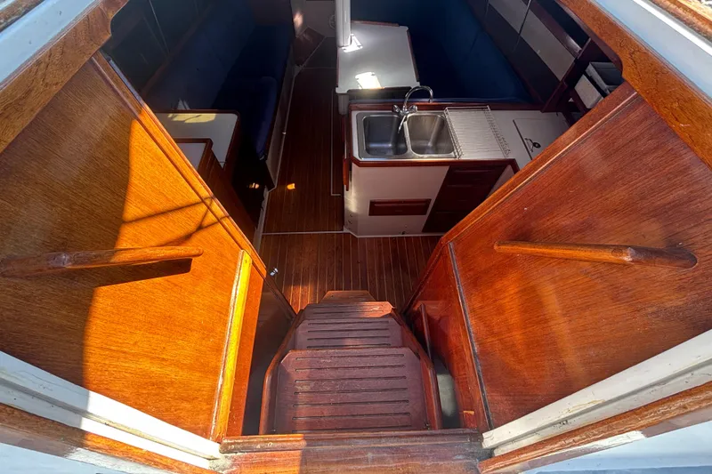 The cockpit is comfortable and functional, offering a great space for sailing or relaxing at anchor. At the Helm, a newer Garmin Chart plotter provides modern navigation capability, bringing updated electronics to this classic cruiser.