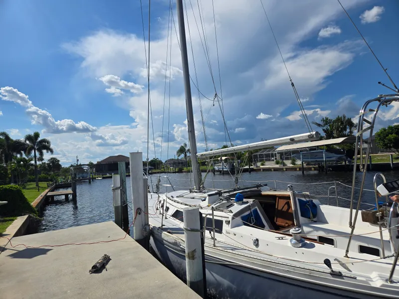 She sustained some hurricane damage: the port-side rub rail and surrounding fiberglass are dinged up, and the bow pulpit is bent. The mainsail is in good condition, and there's a spinnaker onboard. However, the jib sail was destroyed in the storm. The Universal Diesel initially started, but now it won't crank. The mechanic suspects it may have thrown a rod, but we're not certain yet.