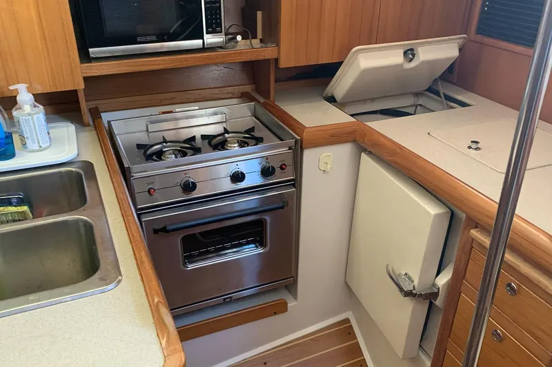 Thoughtfully arranged to starboard at the base of the companionway, the galley offers everything needed for comfortable onboard cooking.