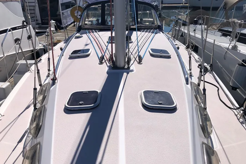 - Shrouds mounted inboard to allow for narrow sheeting angles and ability to carry the larger genoa