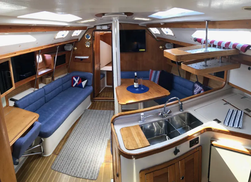 "True North" is noted for her large sea going U shaped galley just starboard of companionway. A very secure feeling working underway or on the hook. Ample counter space and storage.