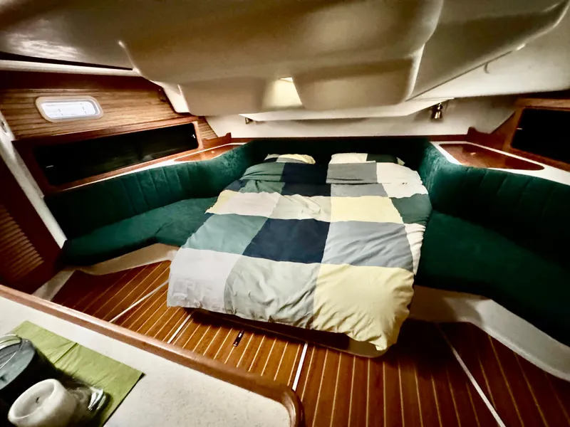 - Fwd stateroom has a V-berth & seating area to port and a large hanging locker