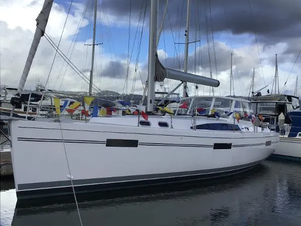 The deck includes twin helms on performance pedestals with pre-stretched cables. The hull features six large fixed ports recessed into the hull for lots of light and visibility. A self-tacking jib and jib traveler are standard, and main and jib sheets are lead to the helm for efficient short-handed sailing. The forward owner’s cabin features a large centerline berth with an elevating adjustable mattress. There are starboard and port aft cabins; the latter is easily convertible to a storage cabin with a "gull wing cockpit hatch". A central accessible mechanical space provides excellent access to primary engine, generator, water heater and air conditioners, which simplifies maintenance and inspections necessary for systems reliability.