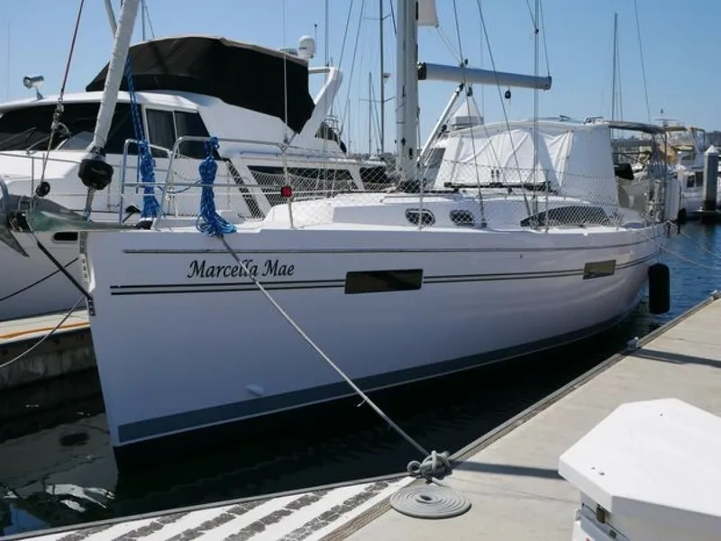 The deck includes twin helms on performance pedestals with pre-stretched cables. The hull features six large fixed ports recessed into the hull for lots of light and visibility. A self-tacking jib and jib traveler are standard, and main and jib sheets are lead to the helm for efficient short-handed sailing. The forward owner's cabin features a large centerline berth with an elevating adjustable mattress. There are starboard and port aft cabins; the latter is easily convertible to a storage cabin with a "gull wing cockpit hatch". A central accessible mechanical space provides excellent access to primary engine, generator, water heater and air conditioners, which simplifies maintenance and inspections necessary for systems reliability.